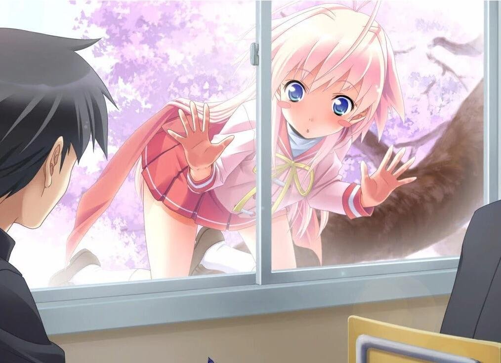 她从二楼的窗户飞扑了过来——之后,这位自称“ウタカタ”的女孩子,接下来的举动也是那么无厘头。 扑上讲台就开始脱衣服,见到我还特别吃惊,只差没把手指伸到我的鼻孔里去了,最后还露出了动物般的耳朵和尾巴。