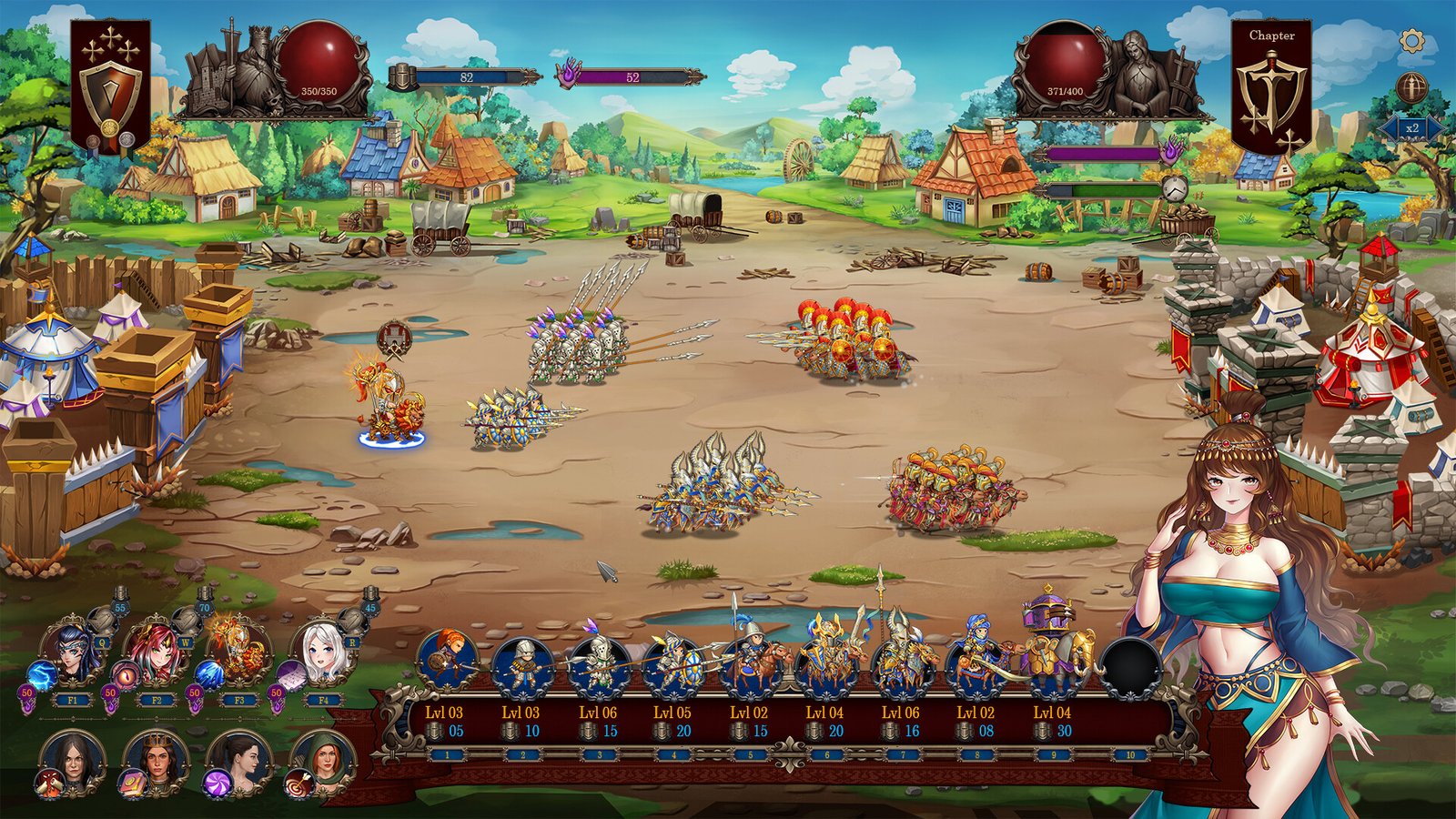《Love n War: Hero by Chance 2》是一款塔防游戏。英雄大人,你与魔龙帝国的战斗仍未结束。你要建设起经济体系,保证国内稳定;同时又要升级作战单位,招募美貌善战的女将,与她们一起击败魔龙龙帝国吧!